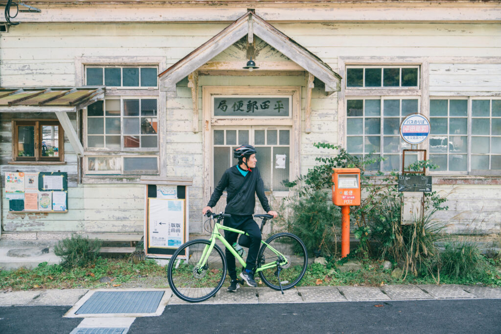 As you cycle along roads bordered by peaceful farmland, a retro yet modern two-story wooden building comes into view. This is the former Hirata Post Office, built in 1925 (Taisho 14). Preserved under the name Old Hirata Post Office, it now serves as a hub connecting people with the community—hosting workshops and occasionally opening as an atelier, coffee stand, or shop. On tours, it is often visited as a popular photo spot.