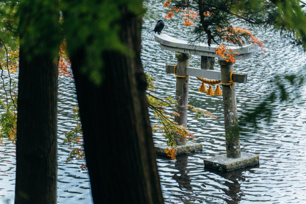 注目は、湖の中に建つ鳥居です。これは、明治時代に行われた神仏分離政策によって『佛山寺』から移されたもので、湖面に浮かぶように佇む姿がとてもきれいです。その鳥居の近くへ行くために山側へぐるりとまわると、龍神伝説が残る『天祖神社』があります。地元の人いわく、神社があるこちら側が金鱗湖の正面という説も。社殿の裏側にまわり、湖に浮かぶ鳥居のそばまで行けるので、ぜひ幻想的な一枚を撮影しましょう。