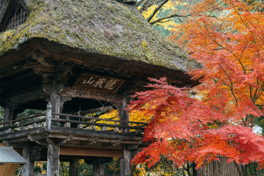 まず見てほしいのが、由布院最古の木造建築である山門。特に茅葺き屋根は、里山の静けさを象徴するような美しさで、300年以上にわたって壊れることなく凛とした姿で佇んでいます。