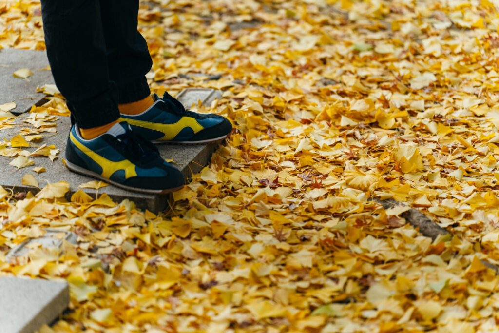 足元にひろがるイチョウの葉が、まるで黄色いじゅうたんのようです。