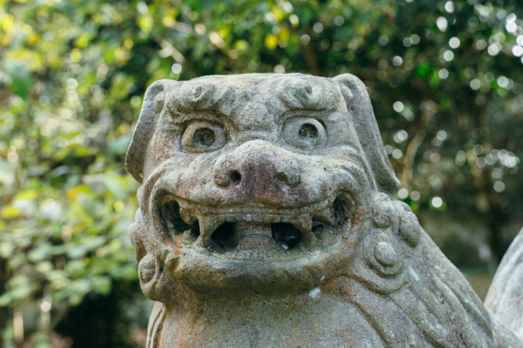 入口で迎えてくれる、笑っているように見える狛犬。