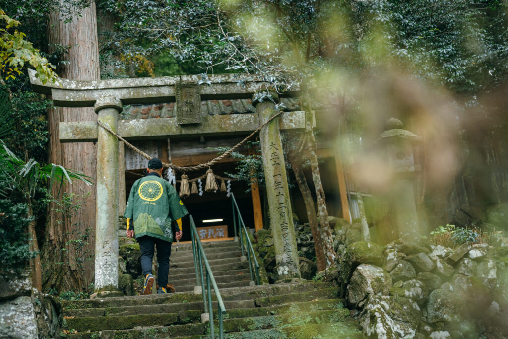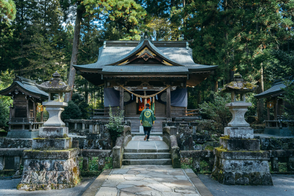 颯爽と自転車を走らせて、中心部から南の方へ。一見、見落としてしまいそうな入口があり、その先に細くて急な坂道が続いています。自転車を停めて歩みを進めると、うっそうと茂る木々が影を落とし、荘厳な雰囲気を醸す社殿が現れます。