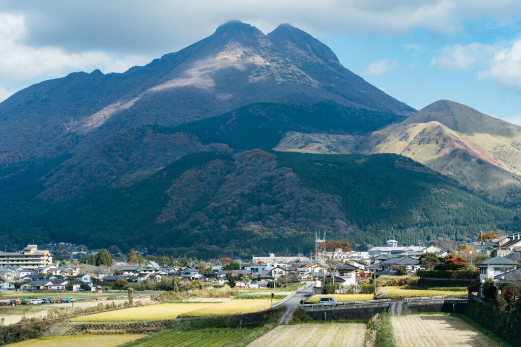 由布岳の麓にひろがる湯布院町。のどかな田園風景に伸びる線路が美しく、盆地であることが一目でわかる場所でもあります。