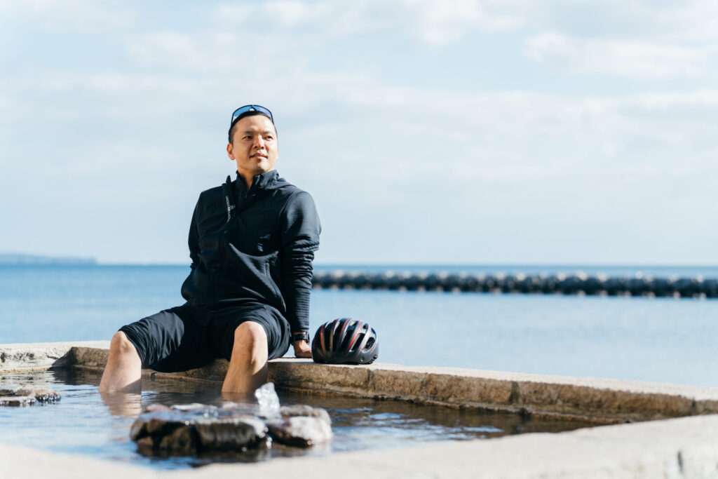 敷地内には、誰でも無料で利用できる足湯が併設されていて、おだやかな海を眺めながら気軽で贅沢な温泉気分を味わえます。サイクリングの疲れを癒しつつ、別府の温泉文化を体感できます。