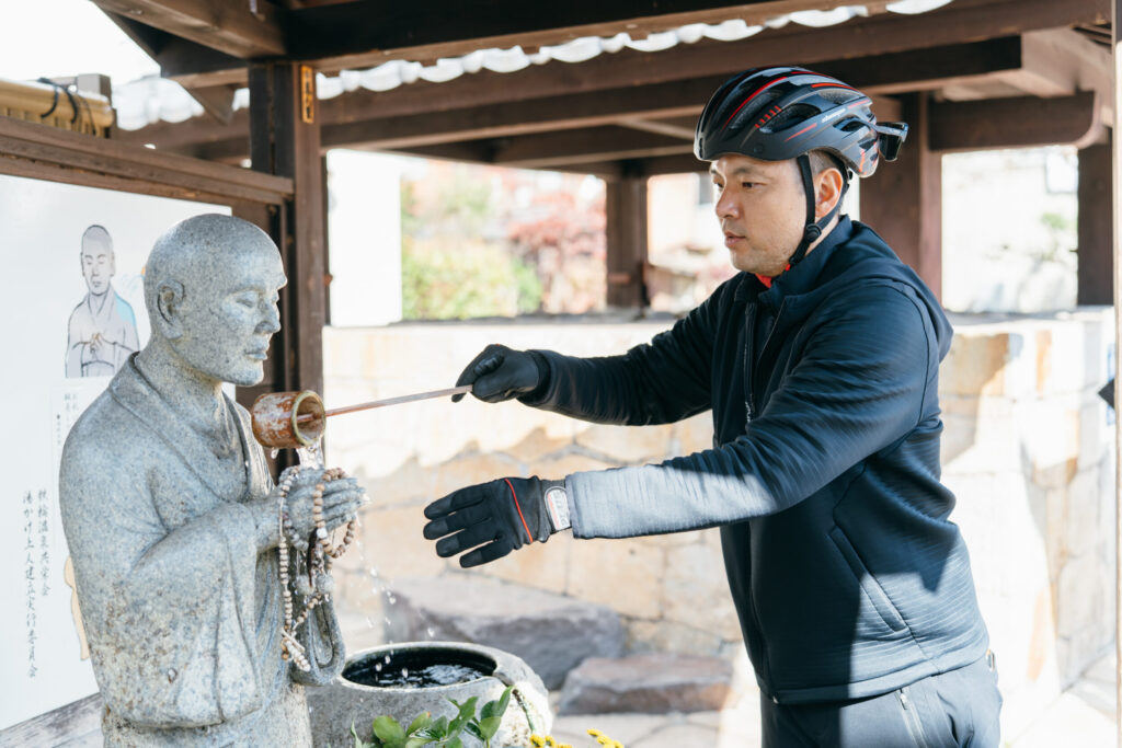 すぐそばには、一遍上人を模した「湯かけ上人様」の像があります。肩や首など、自分の身体の悪い部分や直したい箇所と同じ場所にお湯をかけて治癒を祈願する習わしがあり、たくさんの観光客がお湯をかけている姿も鉄輪らしい光景のひとつです。