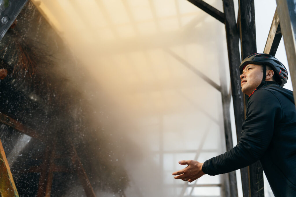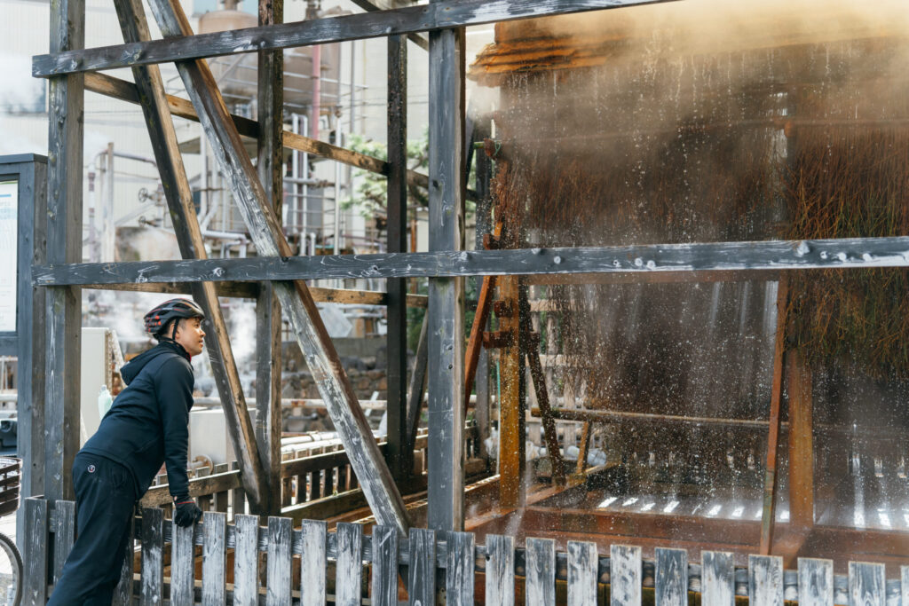 車が通れないほど細いローカルな道を進んでいると、どこからともなく水が勢いよく流れるような音が。そのままペダルをこいで行くと、目の前に現れたのは何やら不思議な装置。これは「竹製温泉冷却装置」という鉄輪の温泉文化を象徴するものです。