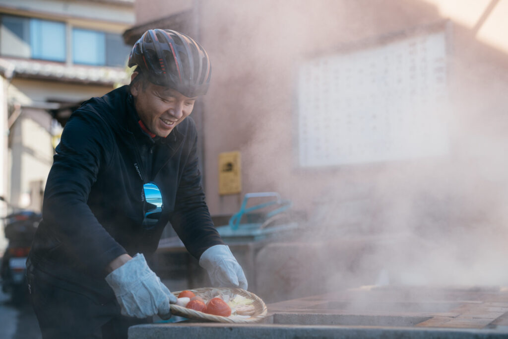 別府湾沿いをライドして心地よい海風を感じた後に、別府八湯のひとつ「鉄輪エリア」をメインに楽しむコース。温泉街は坂道も多いですが、電動自転車で走れるので快適です。地獄蒸し料理や足湯など、温泉地別府らしい体験も満載。地元の人が大切に守り続けている古き良き温泉文化と、活気ある観光地ならではの新しい魅力が共存するエリアで、サイクリングだからこそ気づける発見もあるはずです。