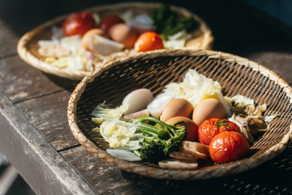 ここでは、宿の外にある「地獄釜」を使って地獄蒸しの体験ができます。『かんなわ六画ストア』で購入した野菜をざるに並べて釜の中へ。食材ごとに蒸し上がり時間が異なるので、タイマーをセットしてしばし待ち時間。このひとときも、にぎやかな観光地とは一線を画す落ち着いた空気に心が癒されます。